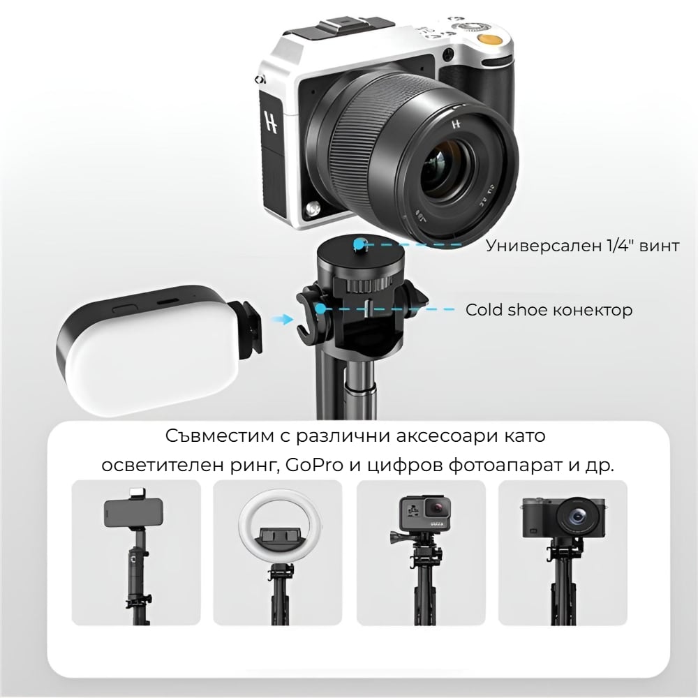 Чрез него можеш лесно да добавиш външно осветление, микрофон, адаптер или друг аксесоар, без да се налага допълнителен статив.