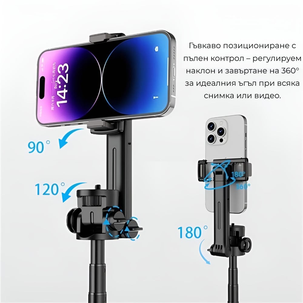 Благодарение на 360° въртящата се глава можеш лесно да сменяш ъгъла на снимане – хоризонтално, вертикално или надглавно. Вграденото Bluetooth дистанционно управление ти позволява да заснемаш без докосване на телефона – идеално решение за влогове, семейни снимки, пътувания или професионално съдържание.