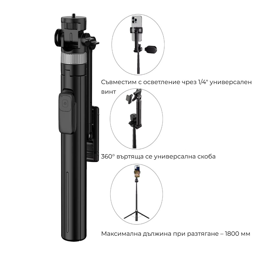 Здравата конструкция и противохлъзгащите накрайници гарантират сигурност и баланс, независимо дали снимаш видео, правиш селфи или стриймваш на живо.