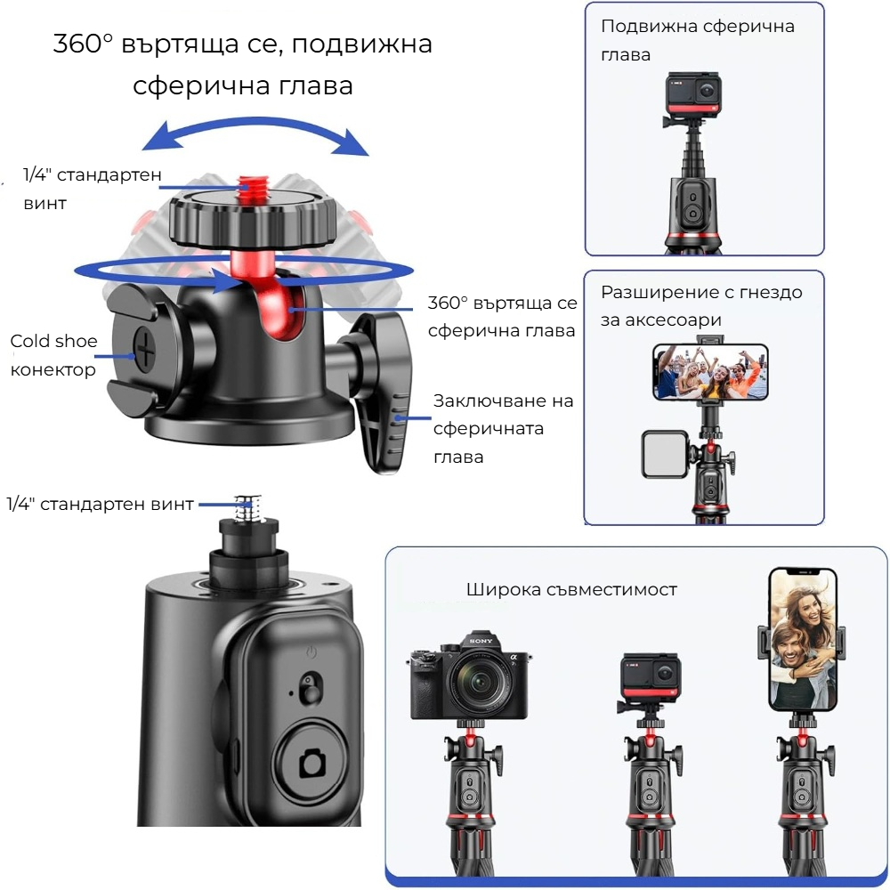 | Тип | 3-в-1 телескопичен статив, селфи стик и държач за телефон |
