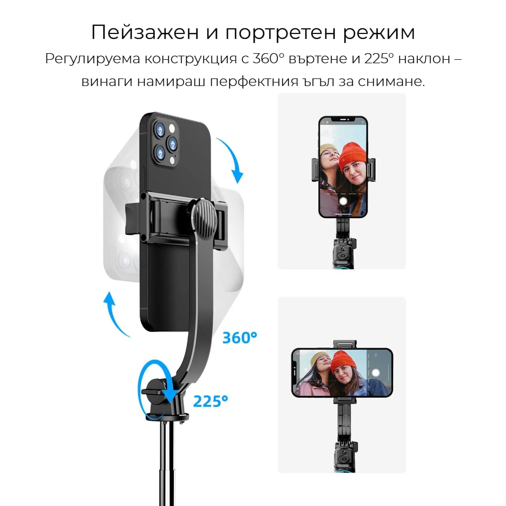 HSU C01 разполага с напълно въртяща се на 360° глава, която ти позволява да променяш ъгъла на снимане само с едно движение. Независимо дали искаш портретен кадър за социалните мрежи или пейзажна снимка за пътуванията си, можеш лесно да превключваш между режимите и винаги да намираш идеалната перспектива.