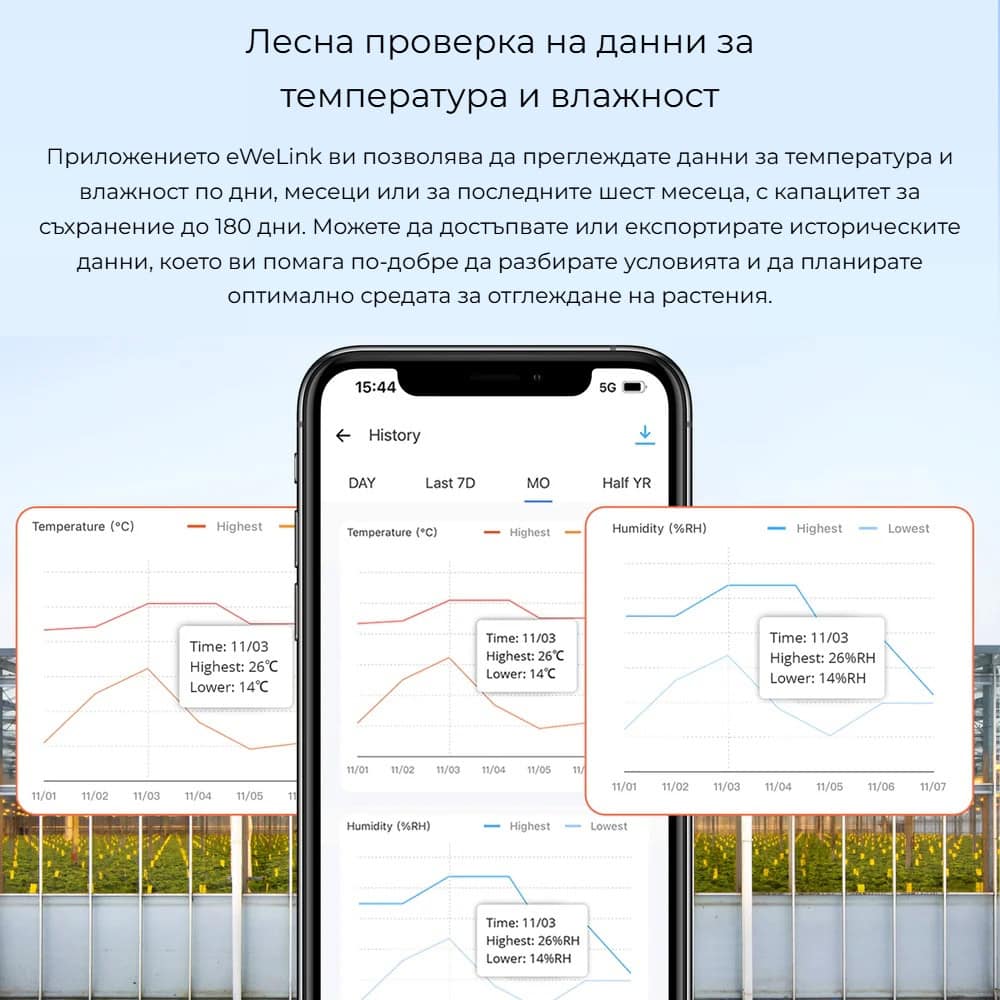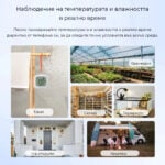 Тази функционалност улеснява проследяването на микроклимата във времето и подпомага анализа и оптимизацията на условията в различни среди, като оранжерии, складове или жилищни помещения.