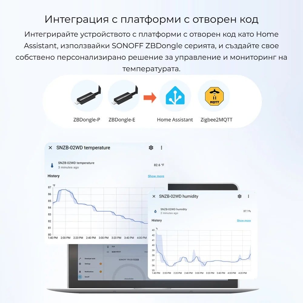 SNZB-02WD е част от екосистемата на SONOFF и може да се използва както с оригинални SONOFF Zigbee хъбове, така и с open-source платформи като Home Assistant и Zigbee2MQTT, което го прави гъвкаво решение за модерни смарт системи.