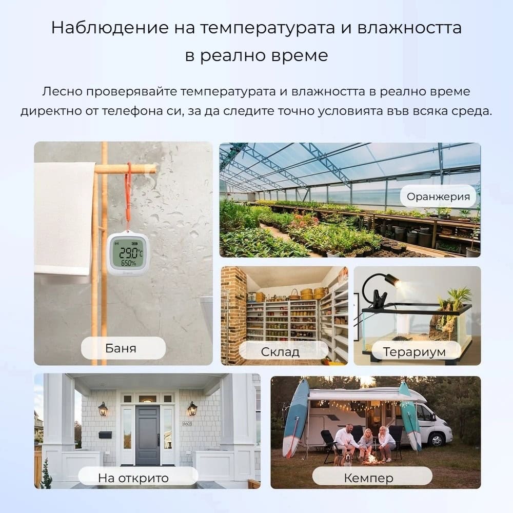 Благодарение на водоустойчивата конструкция и прецизните измервания, SONOFF SNZB-02WD е подходящ за разнообразни приложения – бани, оранжерии, складови помещения, тераси, външни пространства, кемпери и други среди, където е необходимо надеждно следене на температурата и влажността.