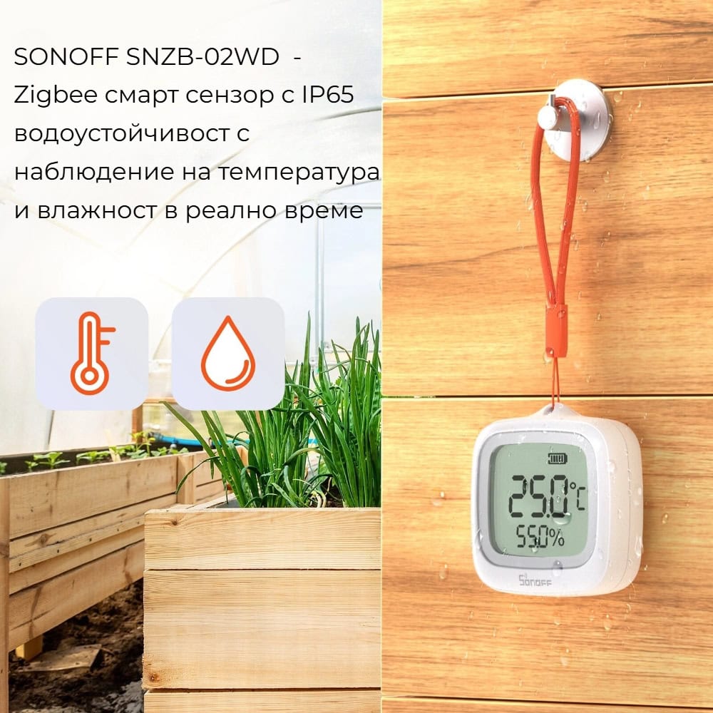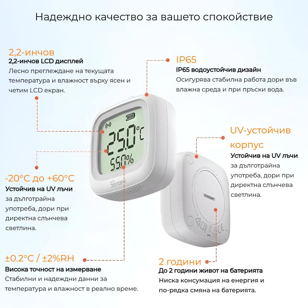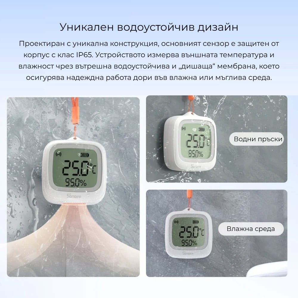 SONOFF SNZB-02WD разполага с IP65 степен на защита, която осигурява надеждна защита от прах и водни пръски. Това позволява устройството да работи стабилно във влажни и външни условия, без риск от повреда при контакт с влага или конденз.