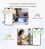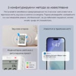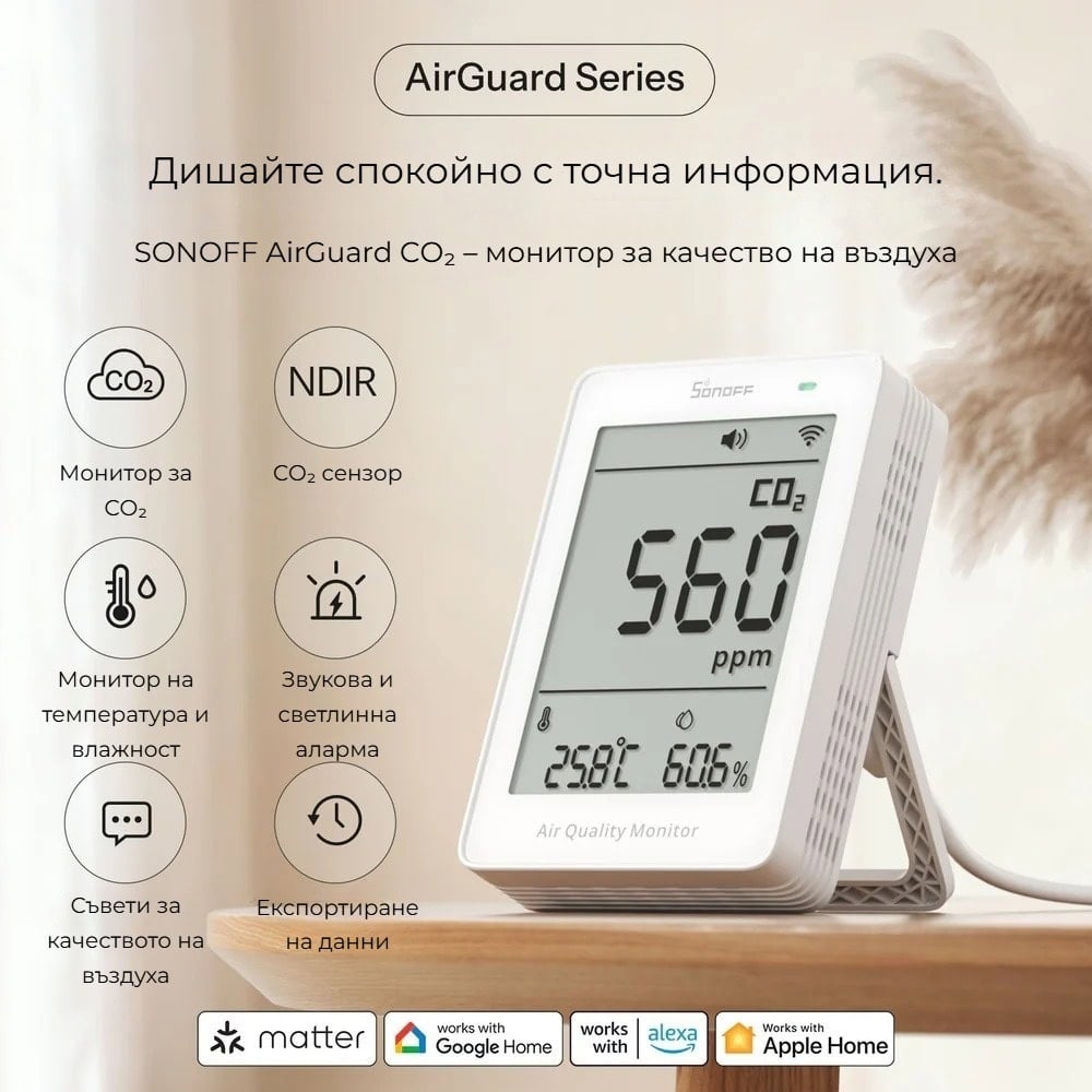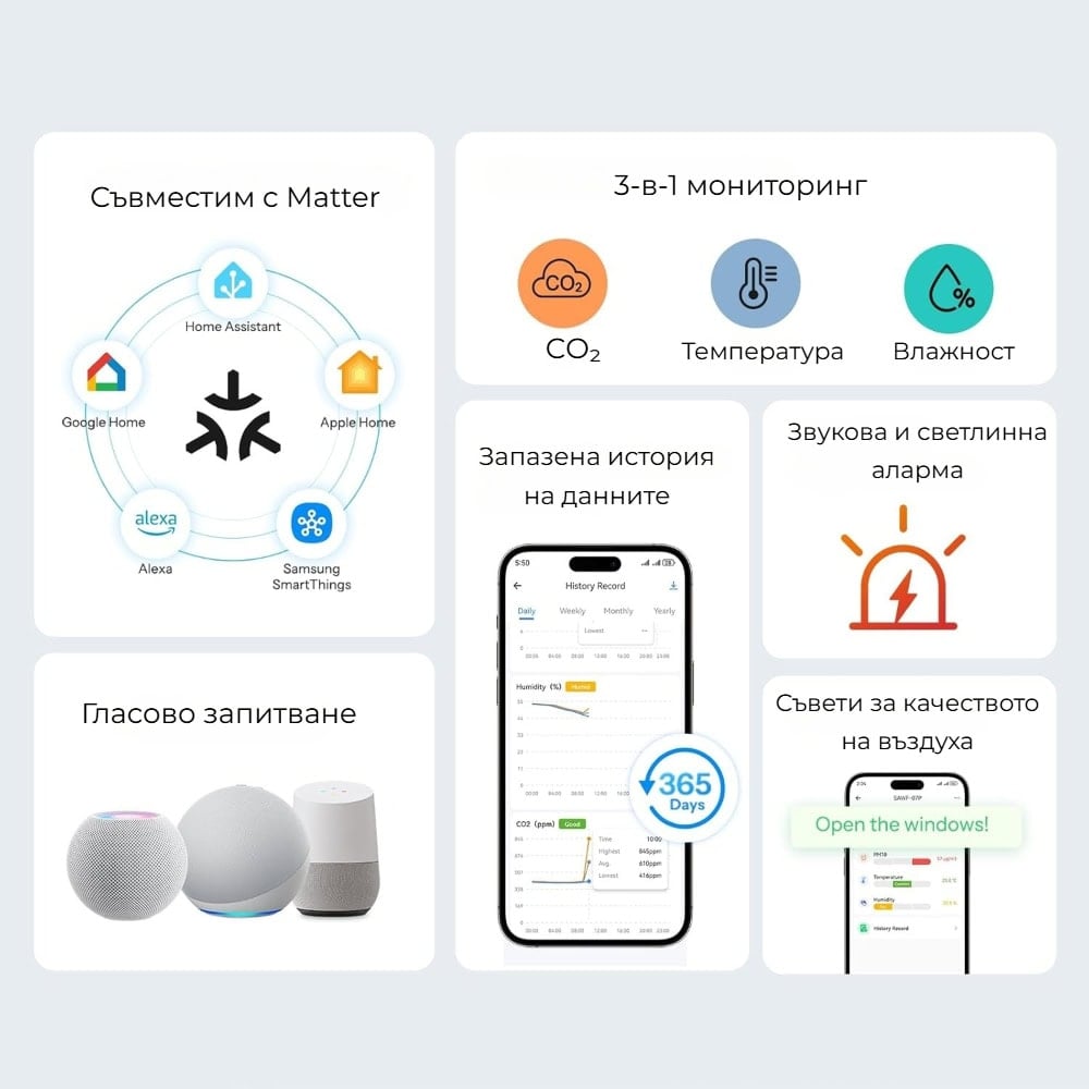 Благодарение на Matter over Wi-Fi, мониторът е съвместим с Apple Home, Google Home, Alexa и други Matter екосистеми. Поддържа известия, звукова и светлинна аларма при превишени стойности, както и преглед и експортиране на исторически данни до 365 дни.