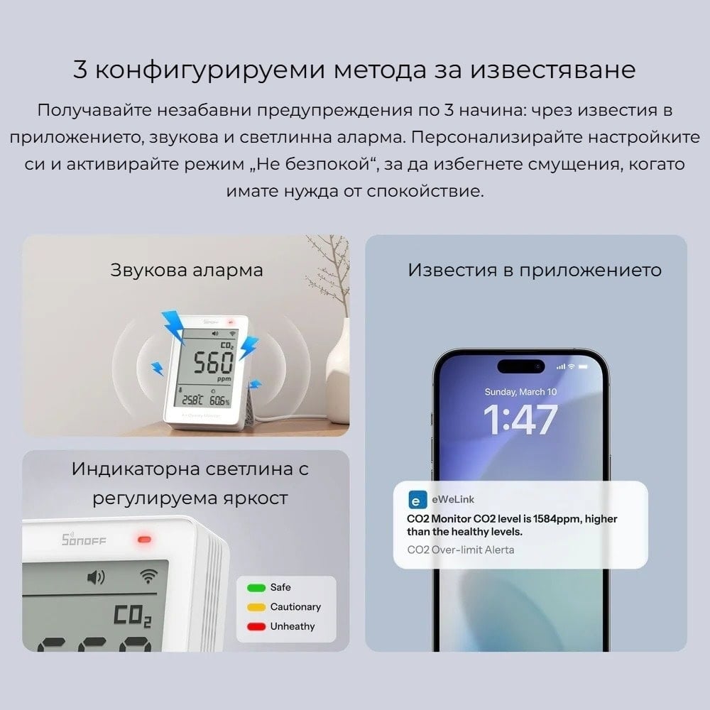 SONOFF SAWF-08P разполага с интелигентна система за предупреждение при повишени нива на CO₂. Устройството може да сигнализира чрез звукова аларма, светлинна индикация и известия в приложението, като праговете за предупреждение могат да се настройват според нуждите. Това позволява навременна реакция и поддържане на по-здравословна среда.