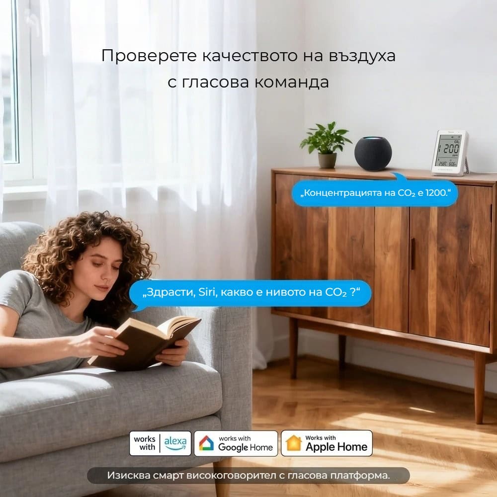 SONOFF SAWF-08P позволява бърза проверка на текущите стойности чрез гласова команда. Чрез Siri, Alexa или Google Assistant можете да получите информация за нивото на CO₂, температурата или влажността без да отваряте приложение. Функцията изисква съвместим смарт високоговорител и интеграция чрез Matter екосистема.