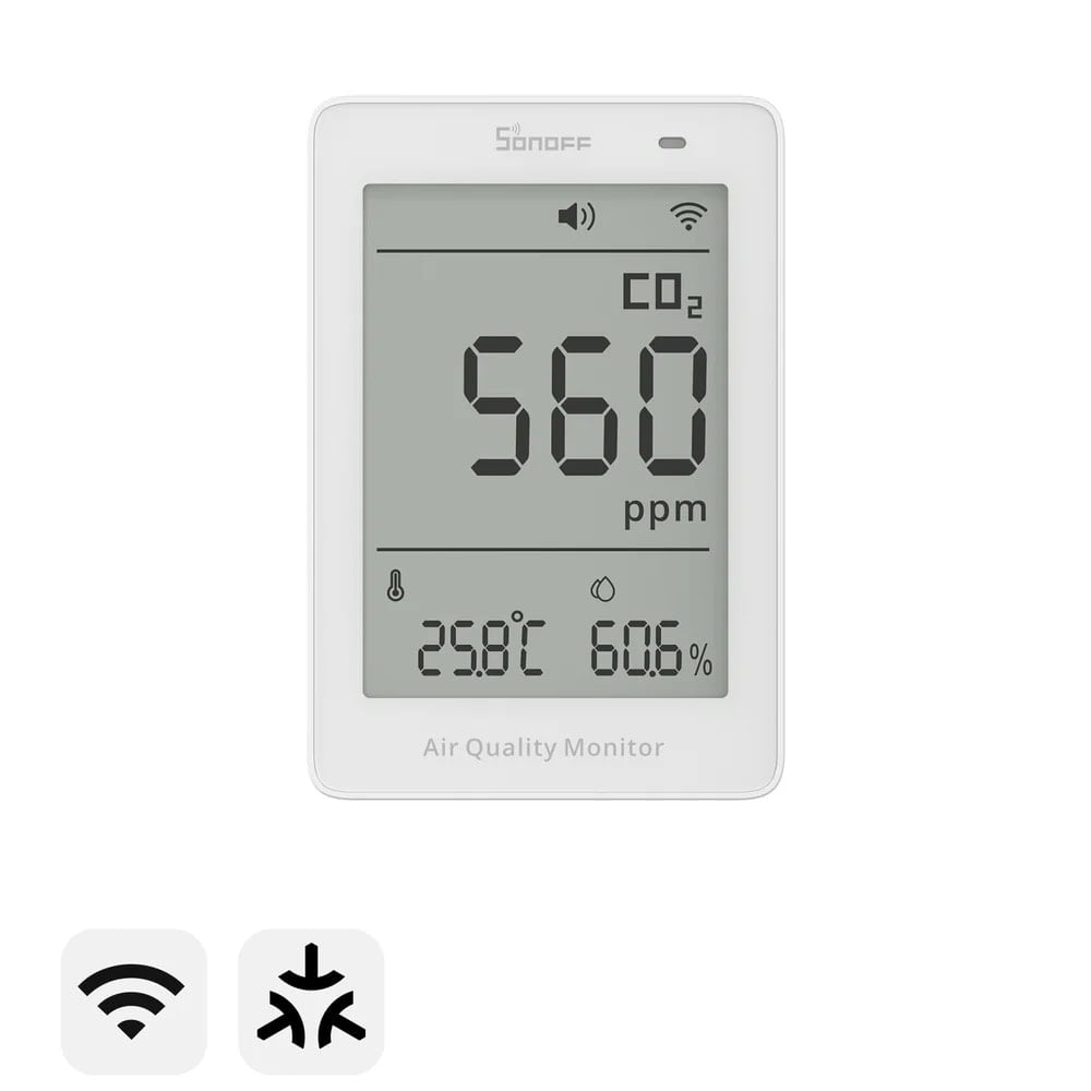 SONOFF SAWF-08P е интелигентен Matter монитор за качество на въздуха, който измерва нивата на CO₂, температура и влажност в реално време. Устройството използва прецизен NDIR сензор за точно отчитане на въглеродния диоксид и предоставя ясна визуализация на данните чрез вграден дисплей.