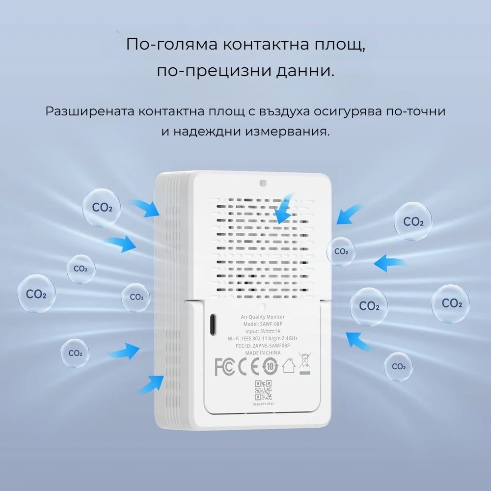 SONOFF SAWF-08P е надеждно решение за всеки, който иска по-здравословна среда у дома или в офиса. С прецизно измерване на CO₂, температура и влажност, интелигентни предупреждения и пълна Matter съвместимост, устройството осигурява постоянен контрол върху качеството на въздуха и ви помага да реагирате навреме за по-комфортно и безопасно ежедневие.