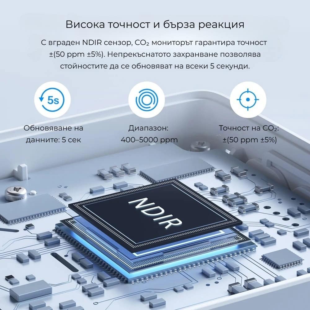 SONOFF SAWF-08P е оборудван с високоточен NDIR (Non-Dispersive Infrared) сензор – професионална технология, използвана за прецизно измерване на въглероден диоксид. Този тип сензор осигурява стабилни и надеждни показания, минимални отклонения и дългосрочна точност без нужда от честа калибрация. Устройството следи нивата на CO₂ в реално време и реагира бързо при повишаване на концентрацията, което ви позволява своевременно да проветрите помещението и да поддържате здравословна и комфортна среда.