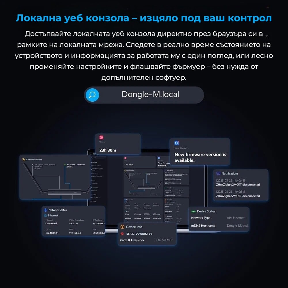 SONOFF Dongle Max (Dongle-M) е „сърцето“ на вашия смарт дом – мощен Zigbee/Thread донгъл, който носи по-силен сигнал и по-стабилна връзка за всички ваши устройства. С три начина на свързване (USB-C, Wi-Fi или Ethernet с PoE) го поставяте точно там, където покритието е най-добро, без компромиси с инсталацията. Двете 5 dBi антени осигуряват отличен обхват и надеждност дори в по-големи жилища. А с локалната уеб конзола управлявате всичко лесно – статус в реално време, настройки и обновяване на фърмуера директно през браузър.