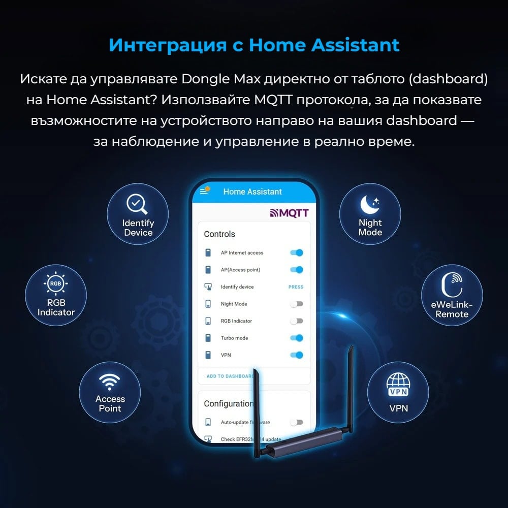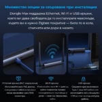Dongle Max е отличен избор за Home Assistant и други смарт платформи, защото може да се интегрира чрез MQTT и да работи с популярни решения като Zigbee2MQTT. Това означава, че Zigbee устройствата ви се появяват в системата с подробни данни (състояния, сензорни стойности, събития) и могат да се управляват в реално време – включване/изключване, сцени, автоматизации и известия. MQTT връзката е лека и надеждна, което прави комуникацията стабилна и подходяща както за малки, така и за по-големи инсталации.