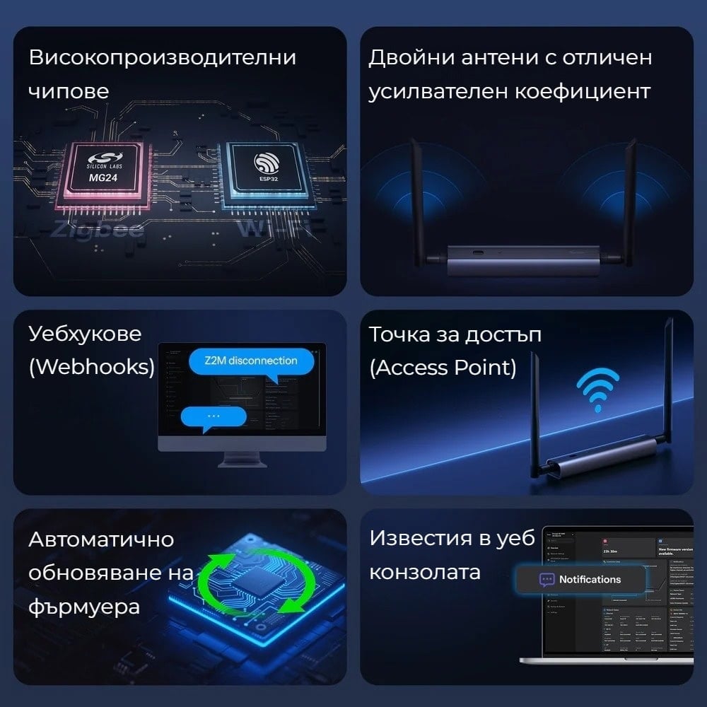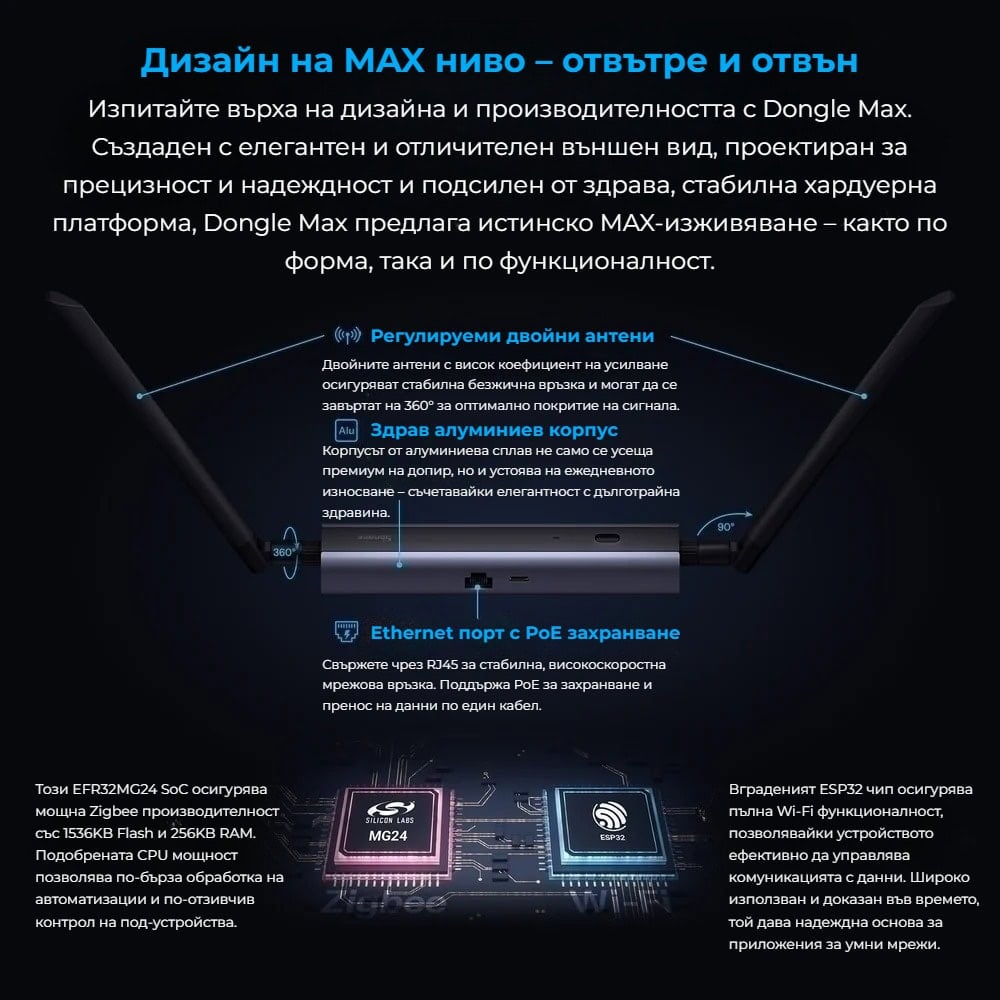 Dongle Max е изграден с мощна хардуерна платформа, която осигурява бърза и стабилна работа дори при по-голям брой Zigbee устройства. Комбинацията от модерен Zigbee/Thread чип и отделен Wi-Fi модул позволява по-ефективна обработка на данни, по-добра отзивчивост и по-надеждна комуникация. Резултатът е по-малко забавяния, по-рядко „изпускане“ на устройства и по-стабилна смарт мрежа при ежедневна работа и автоматизации.