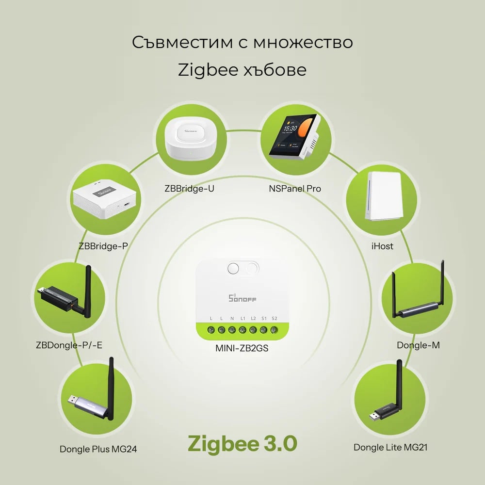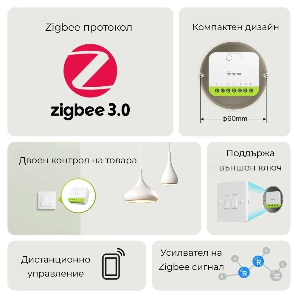 SONOFF MINI DUO ZB2GS е двуканален Zigbee 3.0 смарт реле модул с общ товар до 16A, предназначен за монтаж зад стандартен стенен ключ. Позволява независимо управление на два електрически кръга, поддържа външни ключове и работи като Zigbee рутер за разширяване на обхвата на мрежата.