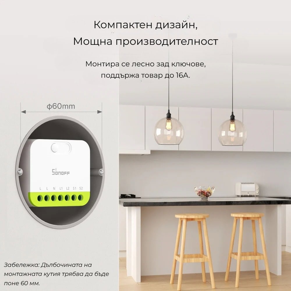 Със своите компактни размери устройството е проектирано за лесен монтаж в стандартни конзолни кутии зад стенен ключ. Малкият форм-фактор позволява интеграция дори в ограничено пространство, без да затруднява инсталацията. Дизайнът осигурява удобство при монтаж и съвместимост с повечето стандартни електроинсталации. Идеално решение за дискретно и ефективно внедряване в съществуващ дом.