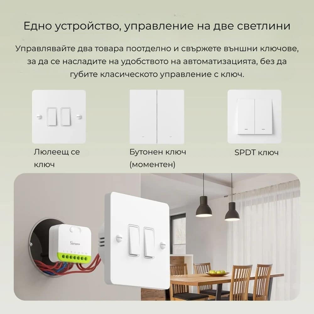 Устройството поддържа свързване към различни типове външни ключове, включително люлеещи, бутонни (моментни) и двупосочни превключватели (SPDT). Това позволява запазване на съществуващата инсталация и удобството на ръчното управление. Всеки канал може да бъде управляван както от физическия ключ, така и дистанционно чрез приложение или автоматизация. Осигурява гъвкавост и лесна интеграция в различни електрически схеми.