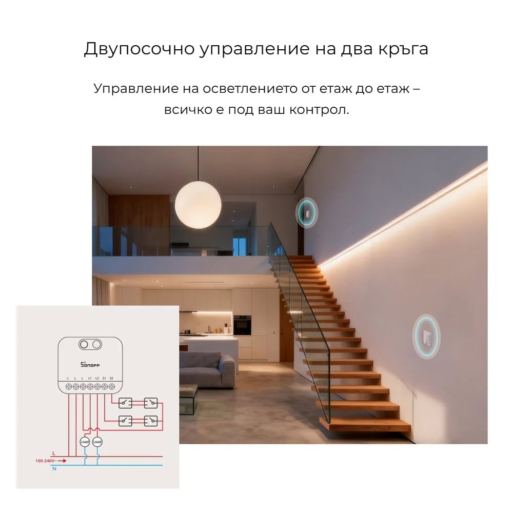 SONOFF MINI DUO-L поддържа двупосочно управление (стълбищна схема), което позволява контрол на едно осветление от две различни места. Това го прави идеално решение за стълбища, коридори и по-големи помещения, където е необходимо управление от повече от една точка.