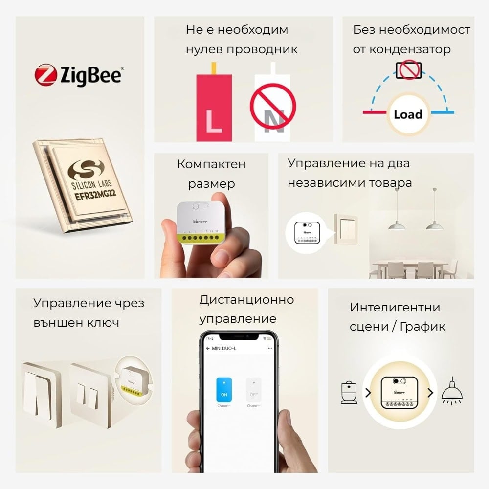 SONOFF MINI DUO-L използва Zigbee 3.0 протокол, който осигурява стабилна, бърза и енергийно ефективна комуникация в смарт дома. Благодарение на mesh технологията, устройствата в мрежата могат да разширяват обхвата си и да поддържат надеждна връзка чрез Zigbee хъб.