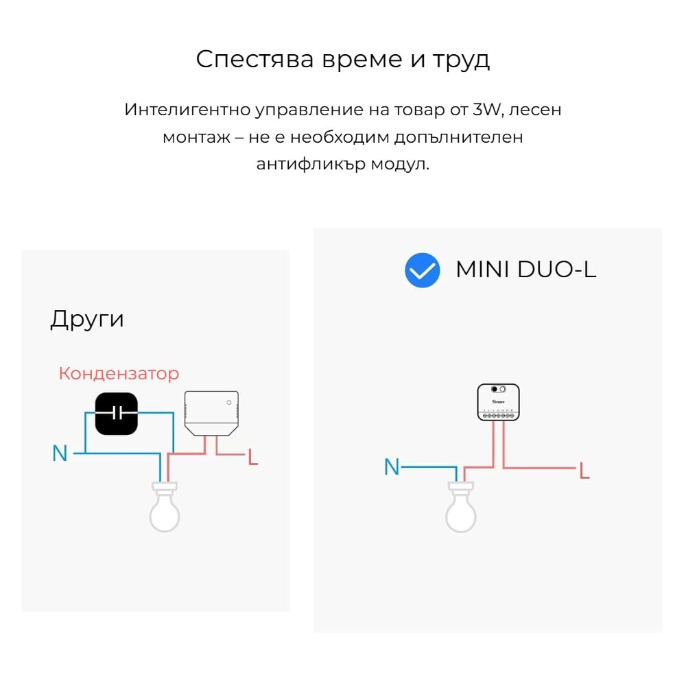 SONOFF MINI DUO-L работи стабилно с LED осветление без необходимост от допълнителен антифликър (байпас) кондензатор. Това предотвратява премигване и слабо светене при изключено положение, като улеснява монтажа и намалява нуждата от допълнителни компоненти.