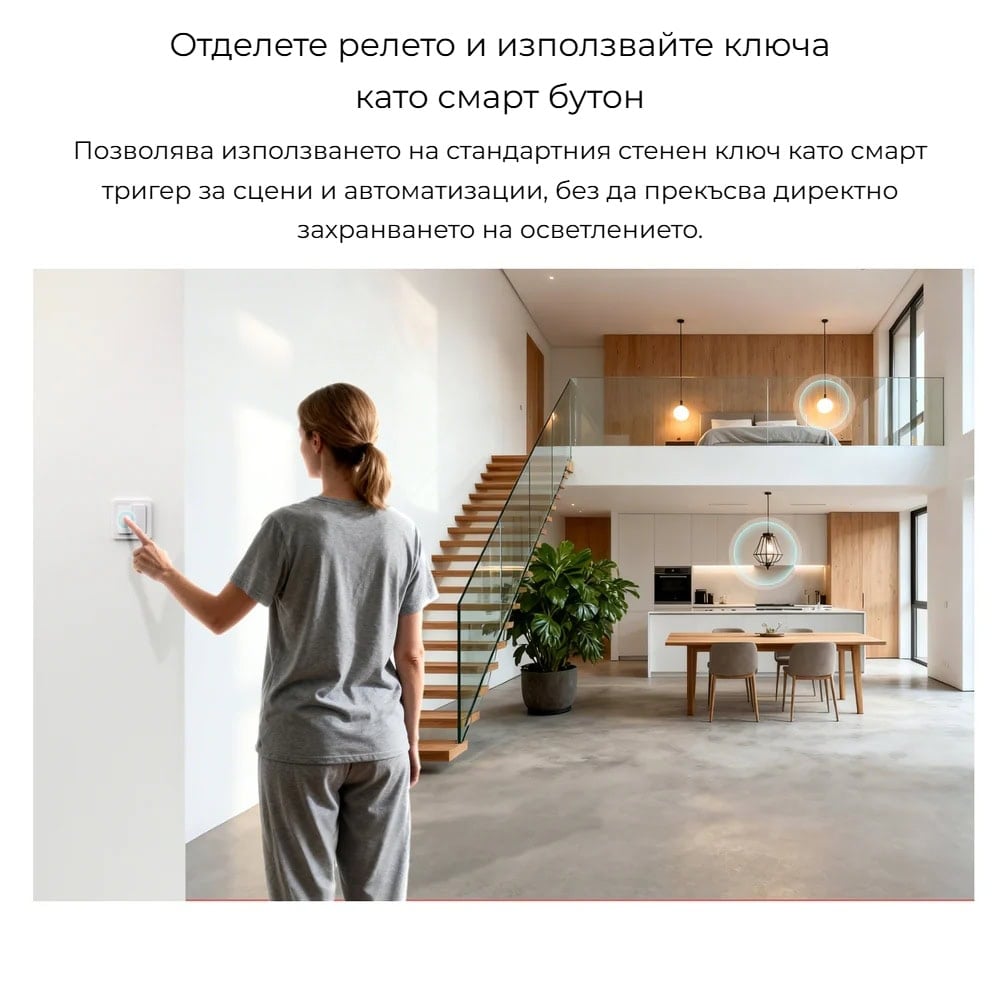 Режимът „Отделено реле“ позволява физическият стенен ключ да бъде отделен от реалното включване и изключване на товара. Вместо директно да прекъсва захранването, ключът може да се използва като смарт тригер за активиране на сцени, автоматизации или управление на други устройства в системата.