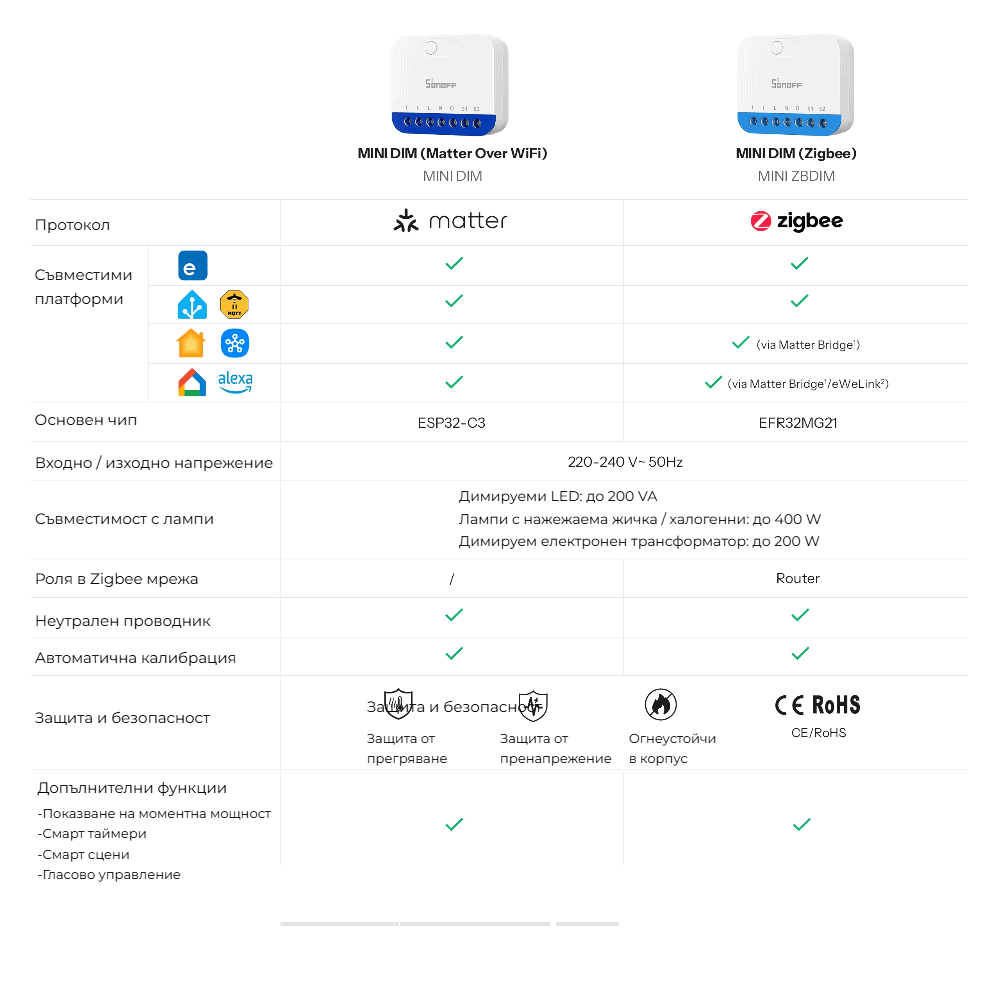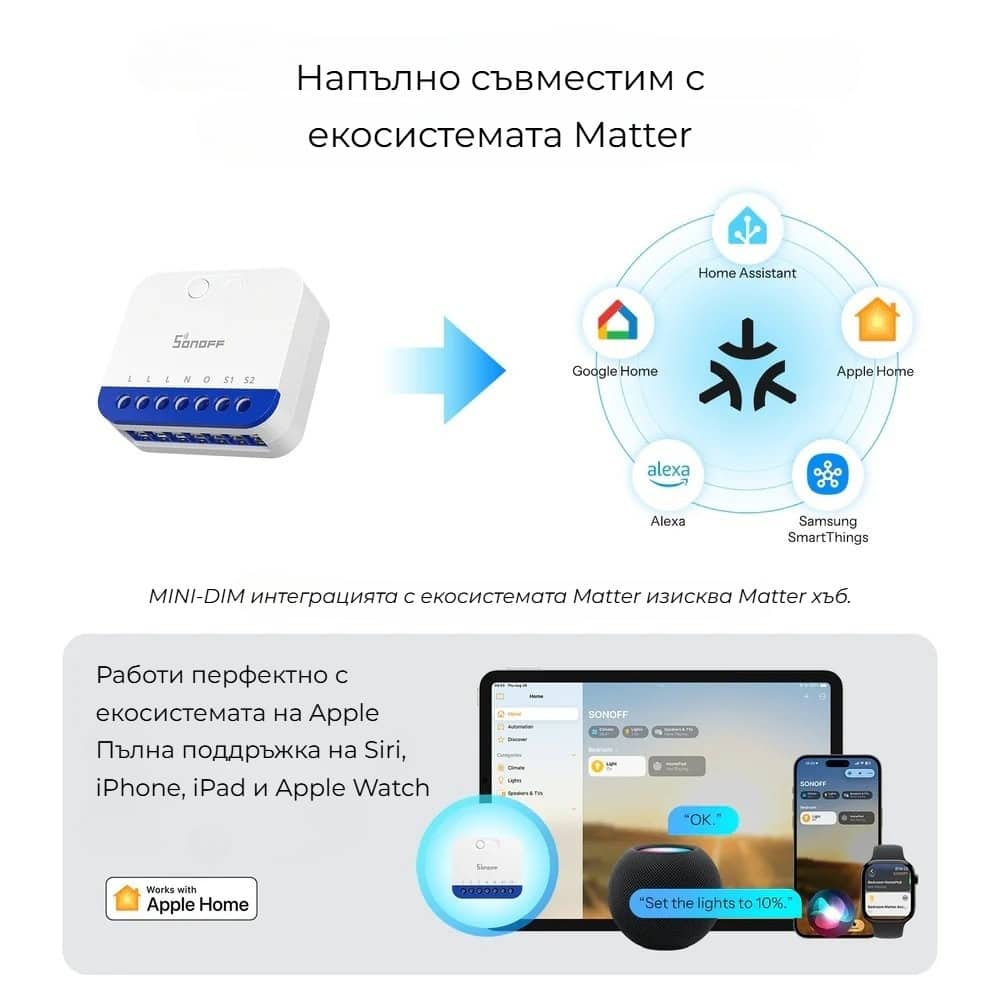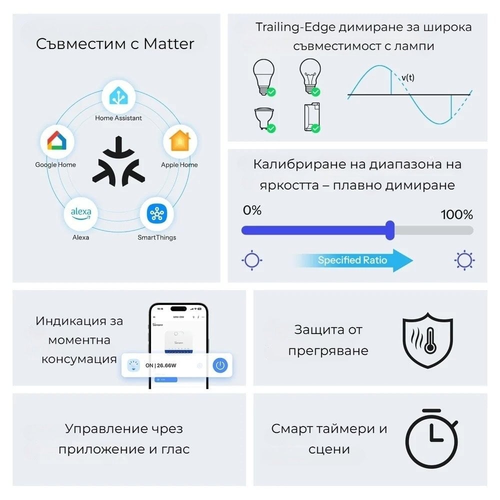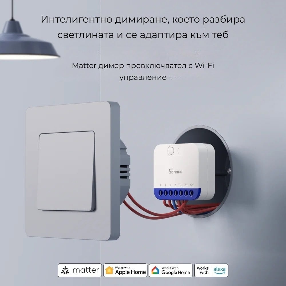 SONOFF MINI DIM поддържа Matter протокол, който позволява лесна и надеждна интеграция със съвременни смарт дом системи. Благодарение на тази технология, устройството може да работи с различни платформи като Apple Home, Google Home и Amazon Alexa, без да сте ограничени до една екосистема. Matter осигурява стабилна връзка и по-добра съвместимост между устройствата в смарт дома.