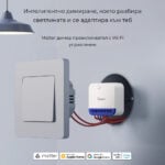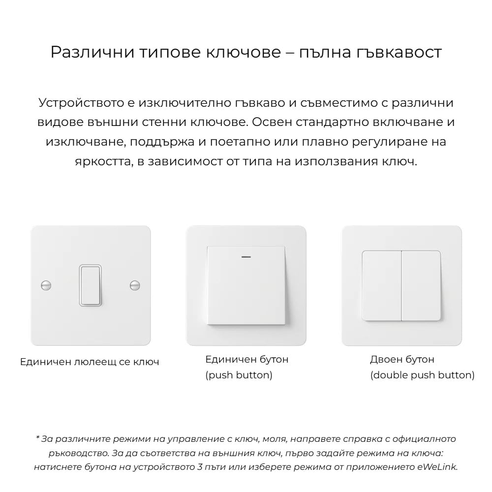 SONOFF MINI DIM е съвместим с различни типове външни стенни ключове, което осигурява гъвкавост при монтаж и използване. Устройството може да работи с единичен люлеещ се ключ, единичен бутон (push button) и двоен бутон, като поддържа както стандартно включване и изключване, така и регулиране на яркостта според типа ключ. Това позволява лесна интеграция в съществуващата електрическа инсталация без необходимост от смяна на ключовете.