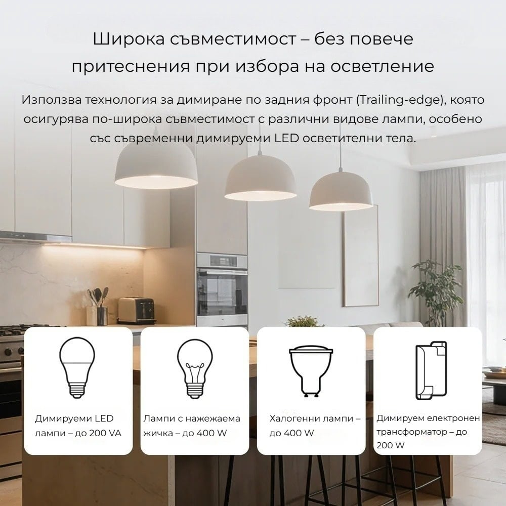 | Съвместими лампи (макс. натоварване) | Димируеми LED лампи – до 200VAЛампи с нажежаема жичка – до 400WХалогенни лампи – до 400WДимируем електронен трансформатор – до 200W |