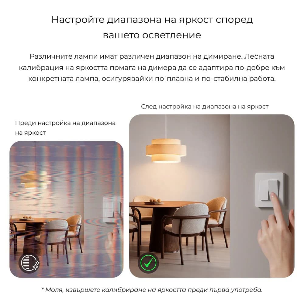 SONOFF MINI DIM разполага с функция за калибриране на диапазона на яркостта, която позволява устройството да се адаптира спрямо конкретния тип осветление. Тъй като различните лампи имат различен минимален и максимален праг на димиране, калибрацията помага да се постигне по-плавно регулиране и по-стабилна работа. Това намалява възможността от премигване или нестабилна светлина и осигурява оптимално димиране според използваната лампа.