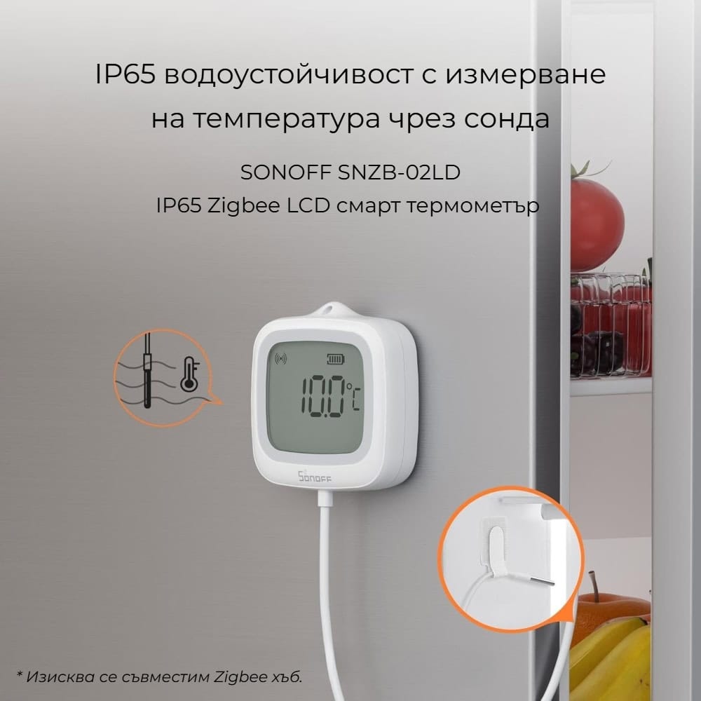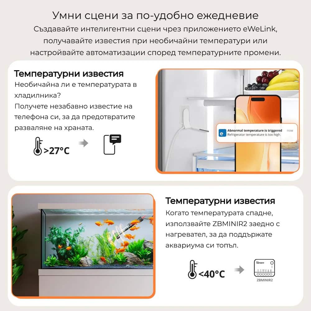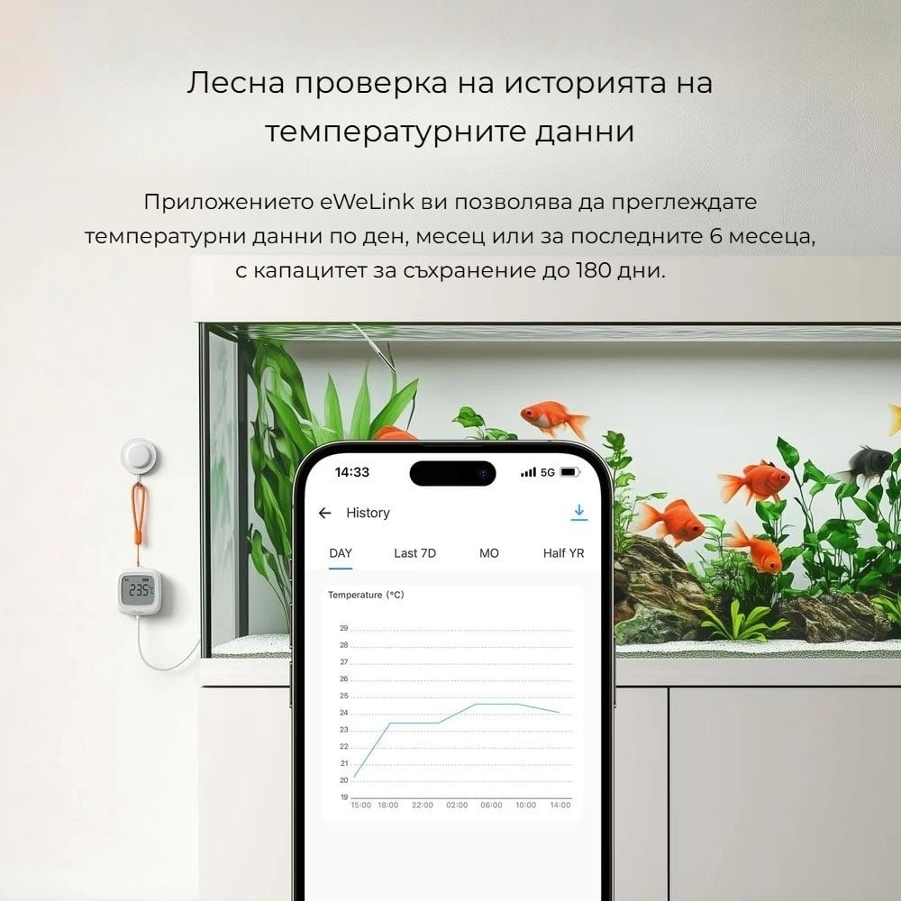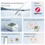 Устройството поддържа Zigbee 3.0 свързаност и работи със съвместим Zigbee хъб, като предоставя данни в реално време чрез приложението eWeLink, възможност за автоматизации, известия при достигане на зададени температурни стойности и интеграция с популярни платформи за умен дом. Ясният 2.2″ LCD дисплей позволява лесно локално отчитане на температурата, а здравият и UV-устойчив корпус гарантира дълготрайна и стабилна работа дори в по-взискателни условия.