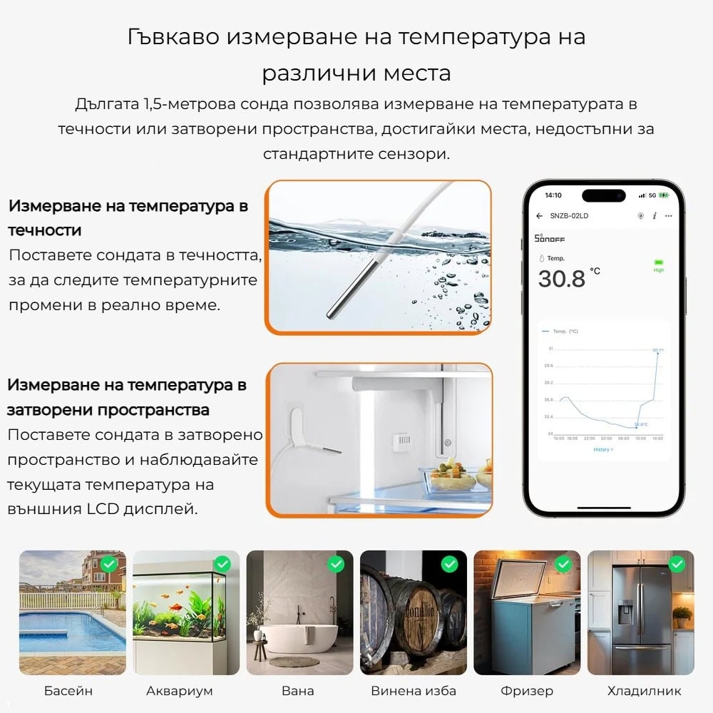 SONOFF SNZB-02LD използва външна температурна сонда, която позволява прецизно измерване на температурата в среди, недостъпни за стандартни сензори. Благодарение на дължината на сондата и изработката ѝ от неръждаема стомана, тя е подходяща за директен контакт с течности, както и за поставяне в затворени пространства като хладилници, фризери, тръби и резервоари.