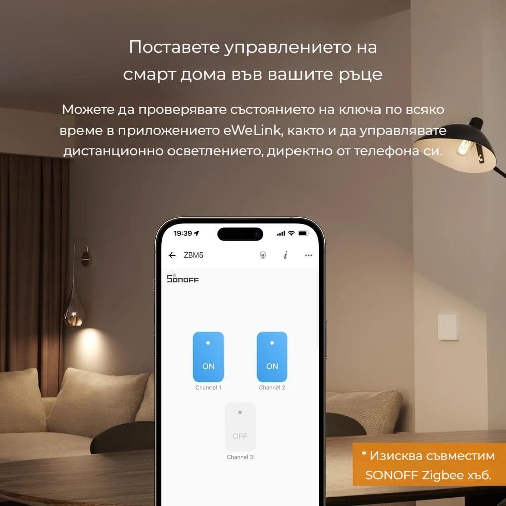 SONOFF SwitchMan ZBM5-86 позволява дистанционно управление чрез приложението eWeLink, като можете да включвате и изключвате осветлението от всяко място. Приложението показва и текущия статус на ключа в реално време, което ви дава постоянен контрол и сигурност, дори когато не сте у дома.