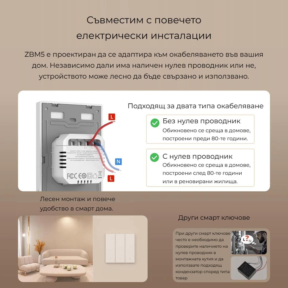 SONOFF SwitchMan ZBM5-86 поддържа монтаж както в инсталации с нулев проводник, така и в такива без нулев проводник, което го прави съвместим с повечето жилищни електрически системи. Това позволява лесна подмяна на стандартен стенен ключ без необходимост от допълнително окабеляване. При монтаж без нулев проводник е необходимо минимално натоварване ≥ 3W, за да работи устройството коректно. Това го прави подходящ както за ново строителство, така и за по-стари жилища.