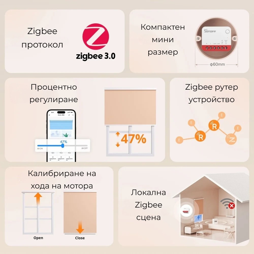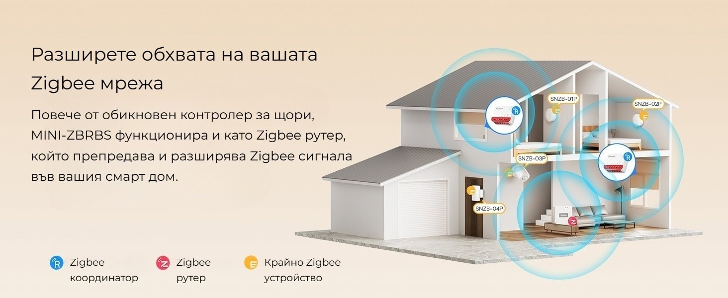 SONOFF MINI-ZBRBS не е просто контролер за щори – той работи и като Zigbee рутер в mesh мрежата. Това означава, че устройството препредава сигнала към други Zigbee устройства и разширява обхвата на мрежата във вашия дом.