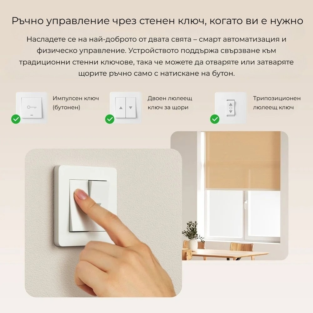 SONOFF MINI-ZBRBS позволява управление на ролетните щори и чрез стандартен стенен ключ, което осигурява удобство и гъвкавост при ежедневна употреба. Дори без телефон или приложение, можете лесно да отваряте и затваряте щорите по традиционния начин.