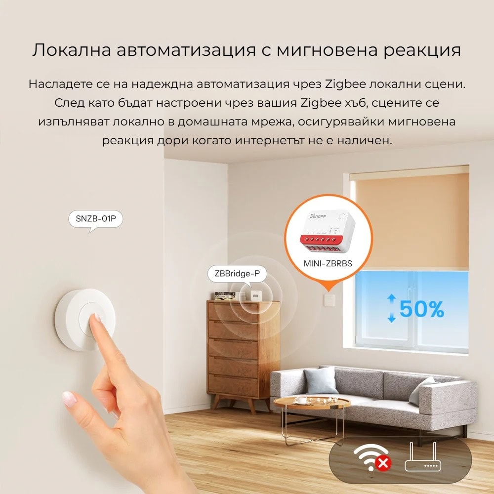 SONOFF MINI-ZBRBS поддържа локални Zigbee сцени, които се изпълняват директно в рамките на вашата домашна мрежа чрез Zigbee хъба. Това означава, че автоматизациите работят бързо и надеждно, дори при липса на интернет връзка.