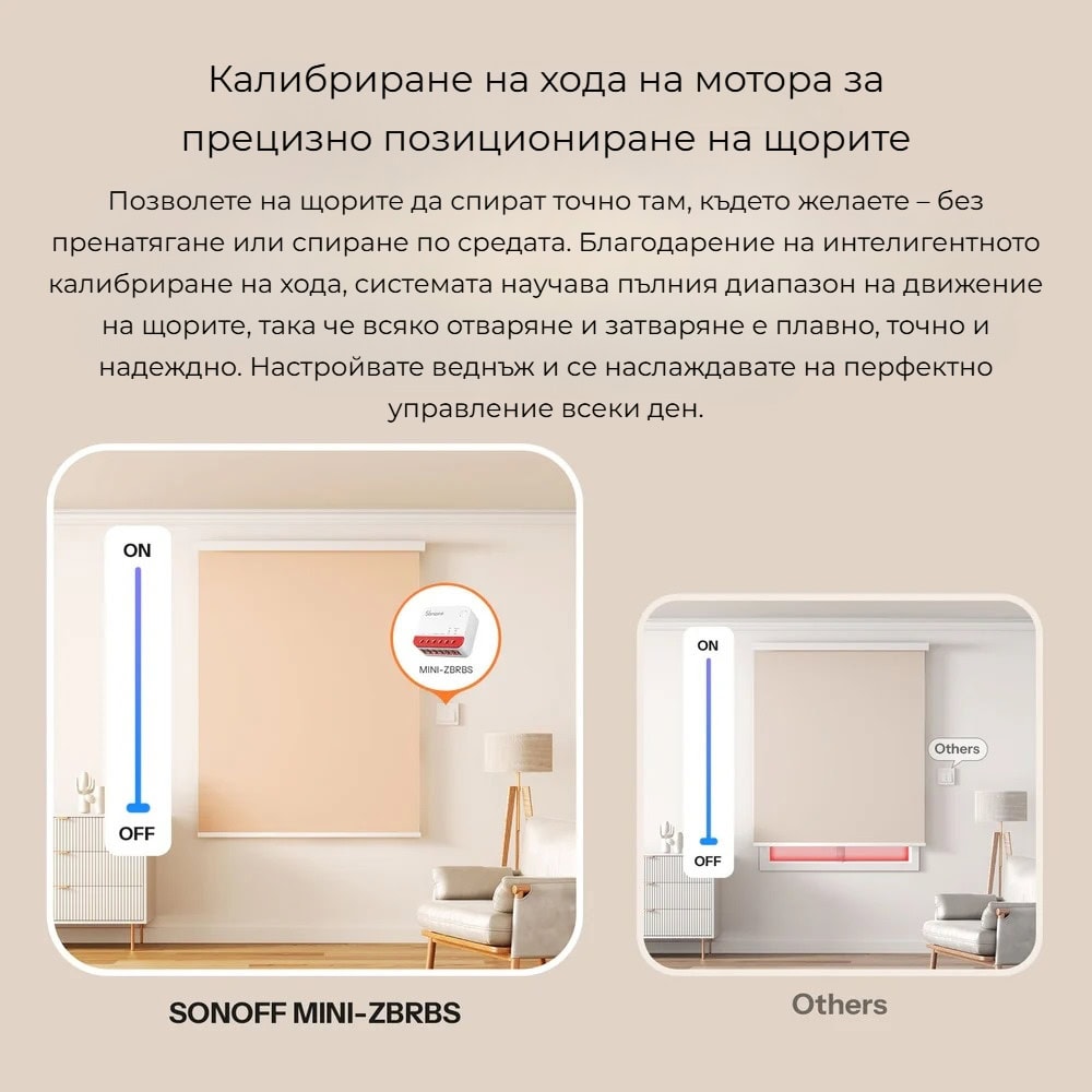 SONOFF MINI-ZBRBS разполага с функция за калибриране на хода на мотора, която осигурява точно и плавно позициониране на щорите. По време на настройката устройството „научава“ пълния диапазон на движение – от напълно отворено до напълно затворено положение.