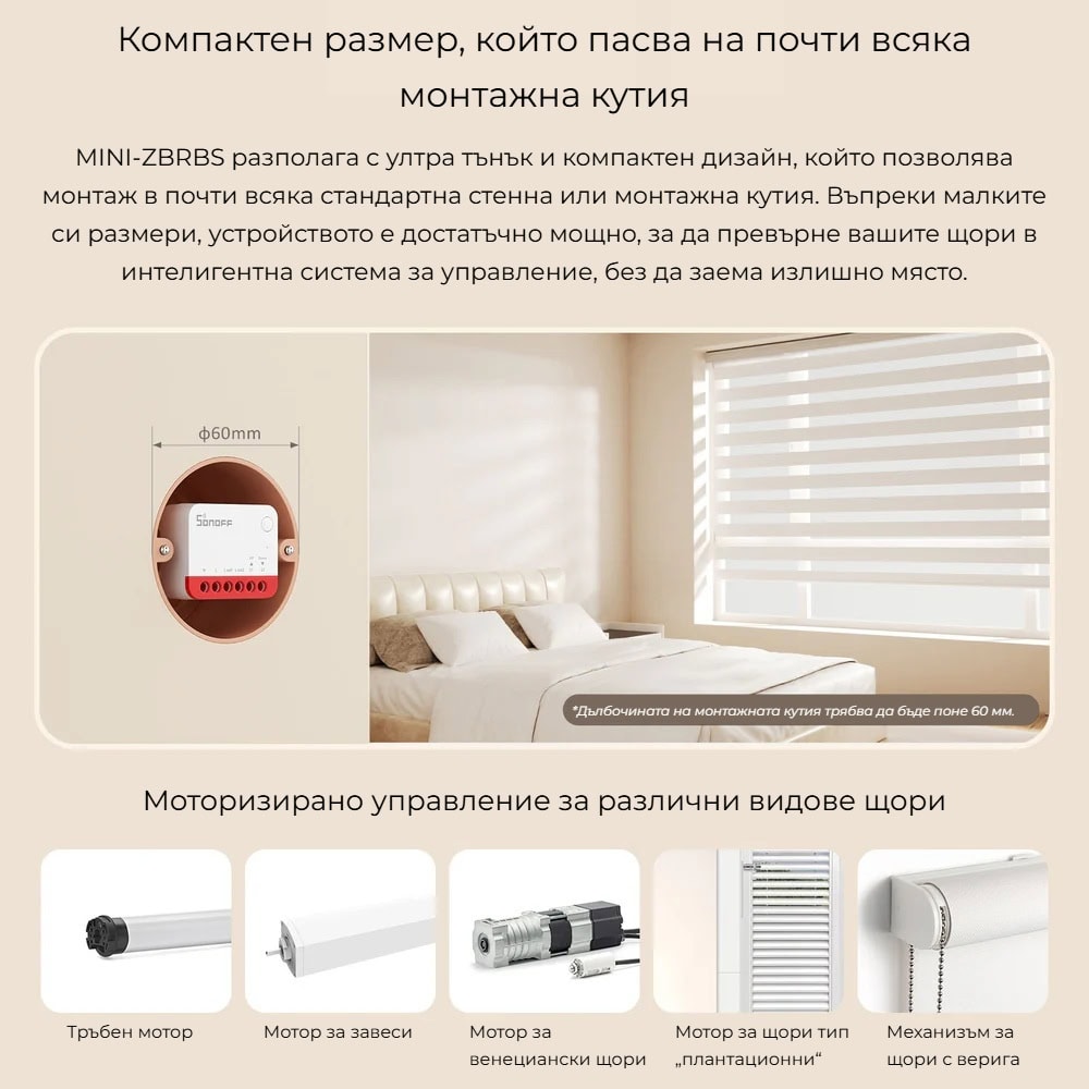 SONOFF MINI-ZBRBS е компактен Zigbee 3.0 смарт модул, предназначен за управление на ролетни щори с AC мотор. Устройството се монтира в стандартна европейска монтажна кутия и се свързва към Zigbee хъб, който позволява дистанционно управление, автоматизации и интеграция в смарт сцени.